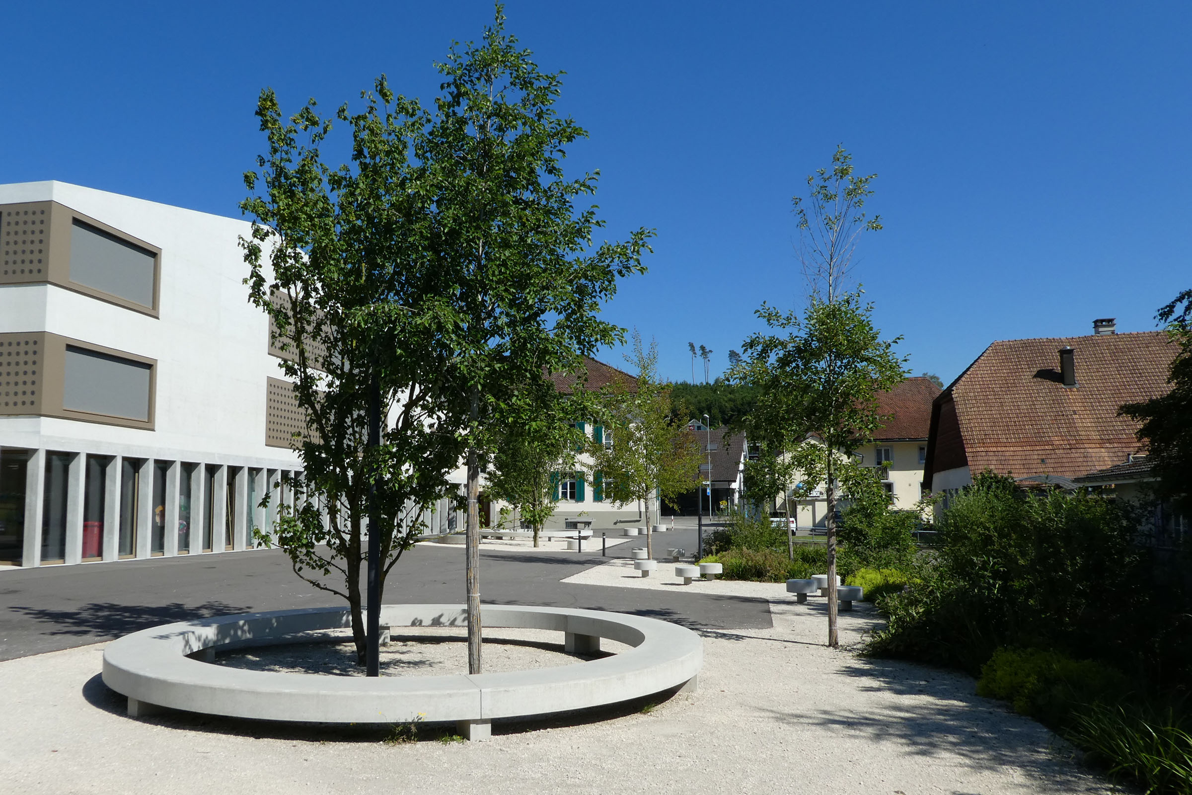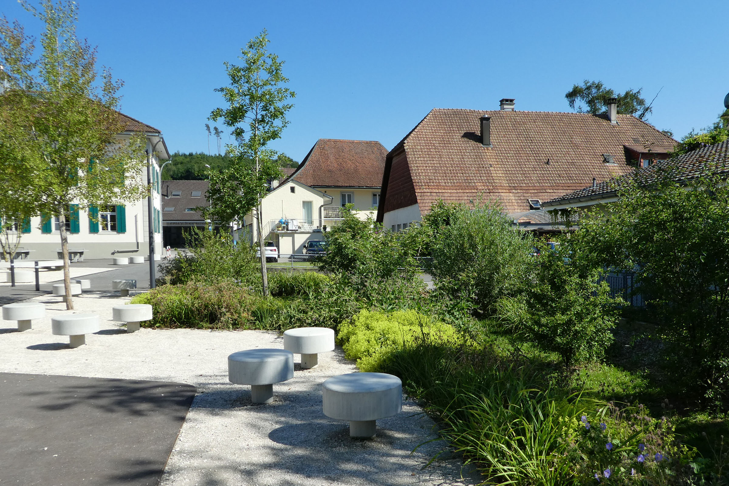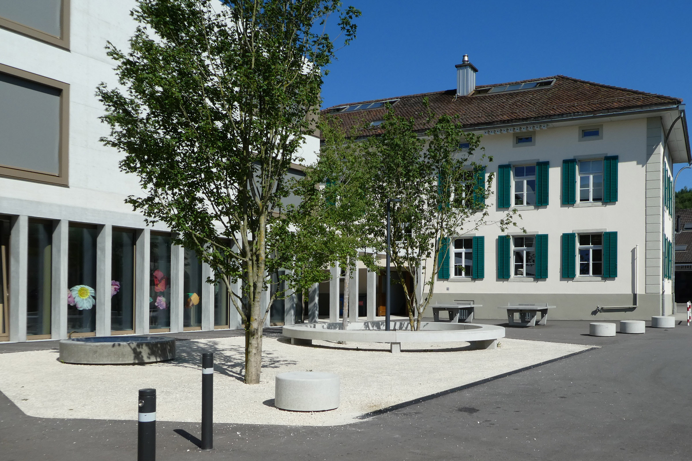 Der Ersatzneubau des Schulhauses ermöglicht eine Reorganisation des Aussenraumes. Der heutige Parkplatz wird zum Pausenplatz, die Autos werden auf einen neu erstellten Parkplatz ausgelagert. Eine Baumpflanzung im Hof gliedert und beschattet den Raum. Runde Sitzelemente auf den beiden Kiesplätzen stehen für Pausen, Freizeit und Unterricht zur Verfügung. Sie sind so gross, dass ganze Schulklassen darauf Platz haben. Ein Versickerungsbecken, mit Sträucher und Stauden bepflanzt, nimmt das gesamte Platzwasser auf. Die Pflanzflächen bilden gleichzeitig einen räumlichen Abschluss zu den Nachbarn. Auf der Westseite begleitet eine Baumreihe die neu erstellte Erschliessungsstrasse.
