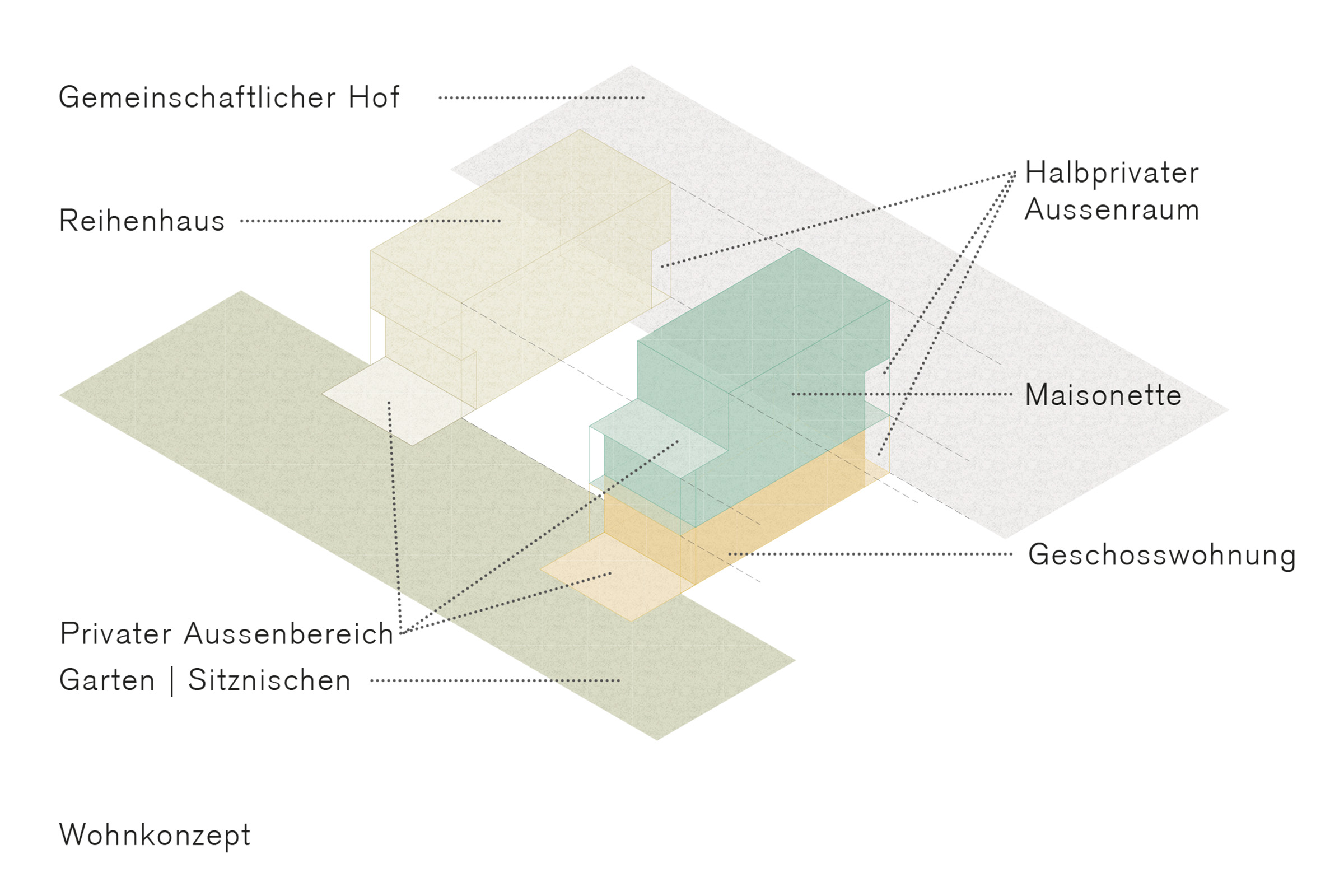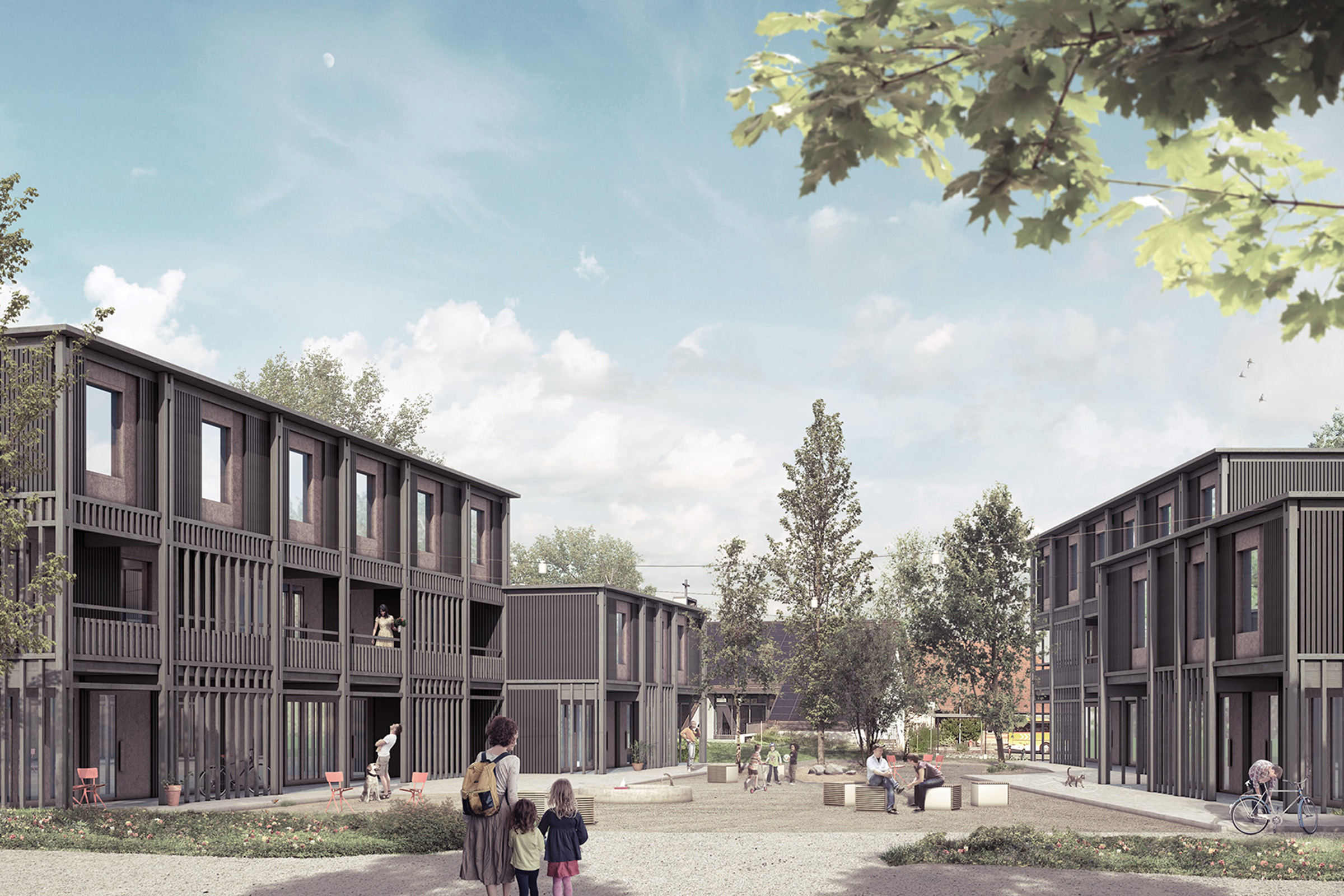 Das Leben in der Siedlung wird durch die Hof-Erschliessung und die Laubengänge gestärkt. Die halböffentlichen Räume ermöglichen eine Interaktion und sind wertvolle Begegnungszonen im Alltag. Unterstützt wird dies durch einen Gemeinschaftsraum, der sich im Bereich des Gebäudeversatzes befindet und sich je nach Anlass Richtung Hof oder Richtung begrünte Sitzplatznische orientiert. Die klar definierten privaten Aussenräume gewährleisten den Bewohnern Rückzugsmöglichkeiten.